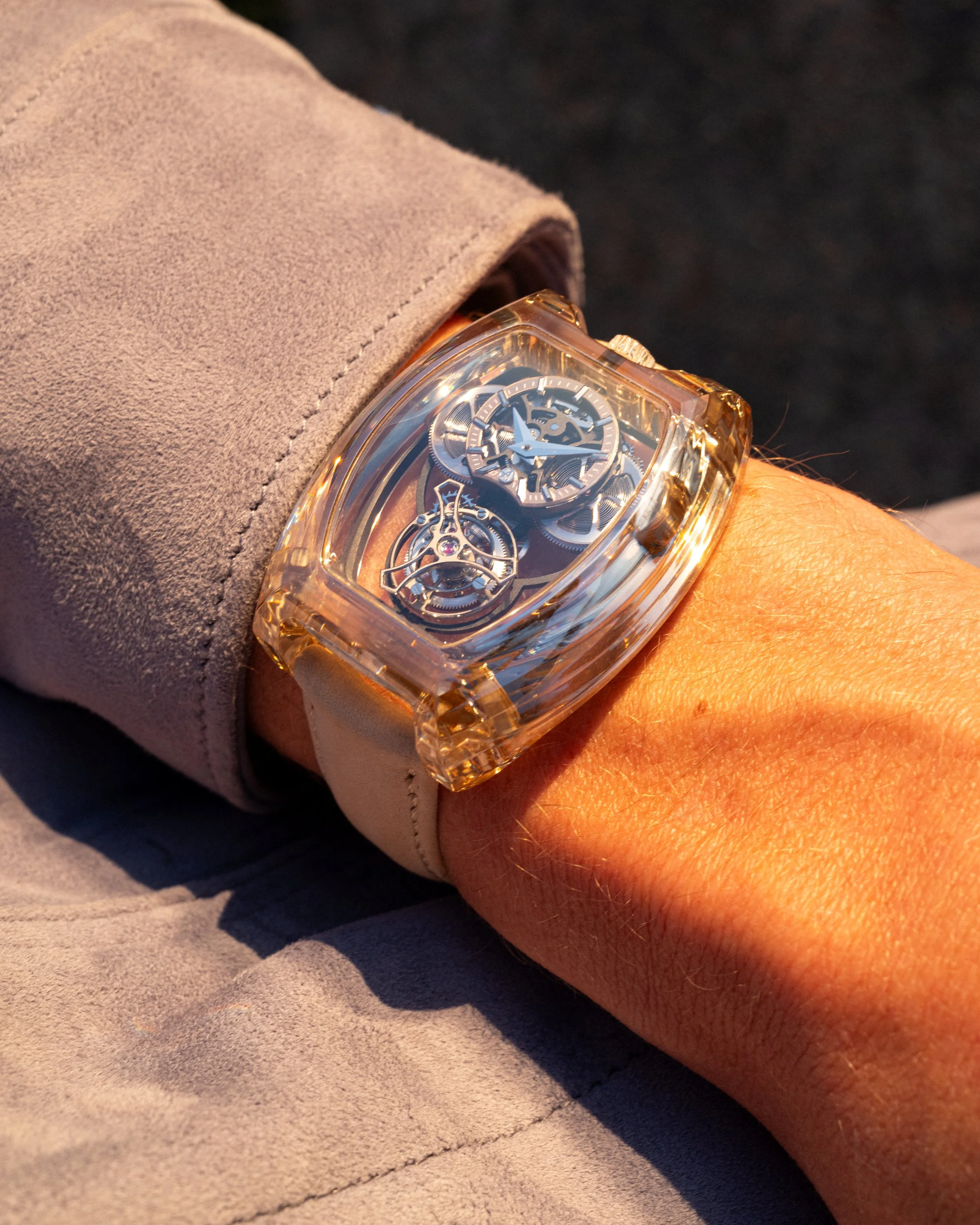 Far more complex than sapphire, moissanite demands extreme mastery and unique expertise. It is Stanislas Arpa, son of the founder, who leads both the creative vision and the development of exclusive machining processes for this exceptional material, establishing within the Geneva workshops an entirely novel know-how with no equivalent in the global watchmaking industry. ArtyA is today the only Maison in the world to possess this expertise. Its subtle champagne hue, of rare sophistication, reveals the full luminous nobility of the material.