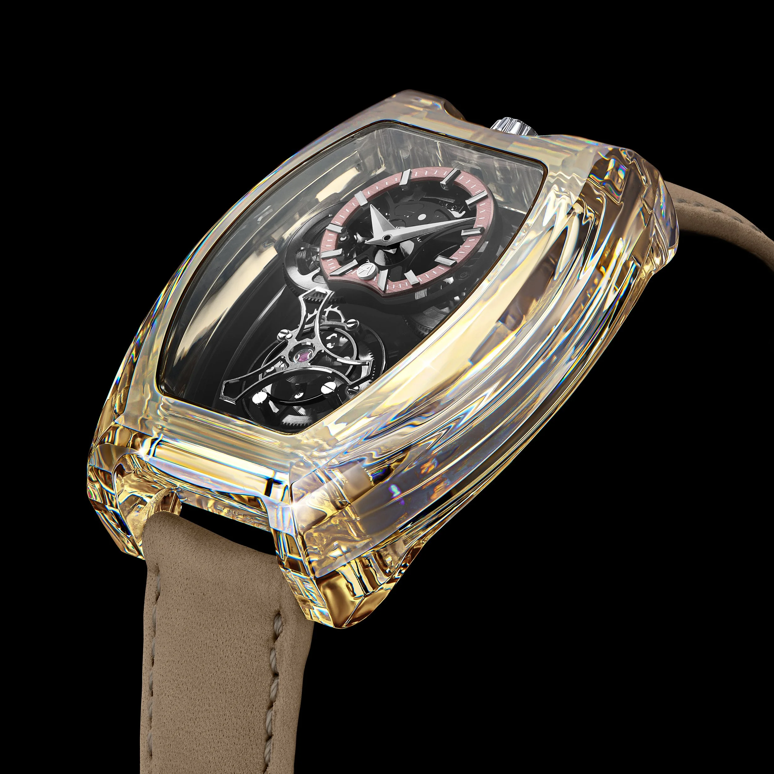 At the heart of this crystalline architecture beats the PUR-T3 Curvy Tourbillon manufacture calibre, developed to follow the curved lines of the case. Its asymmetric architecture showcases the hours and minutes display offset at 3 o’clock, and a tourbillon positioned at 6 o’clock.