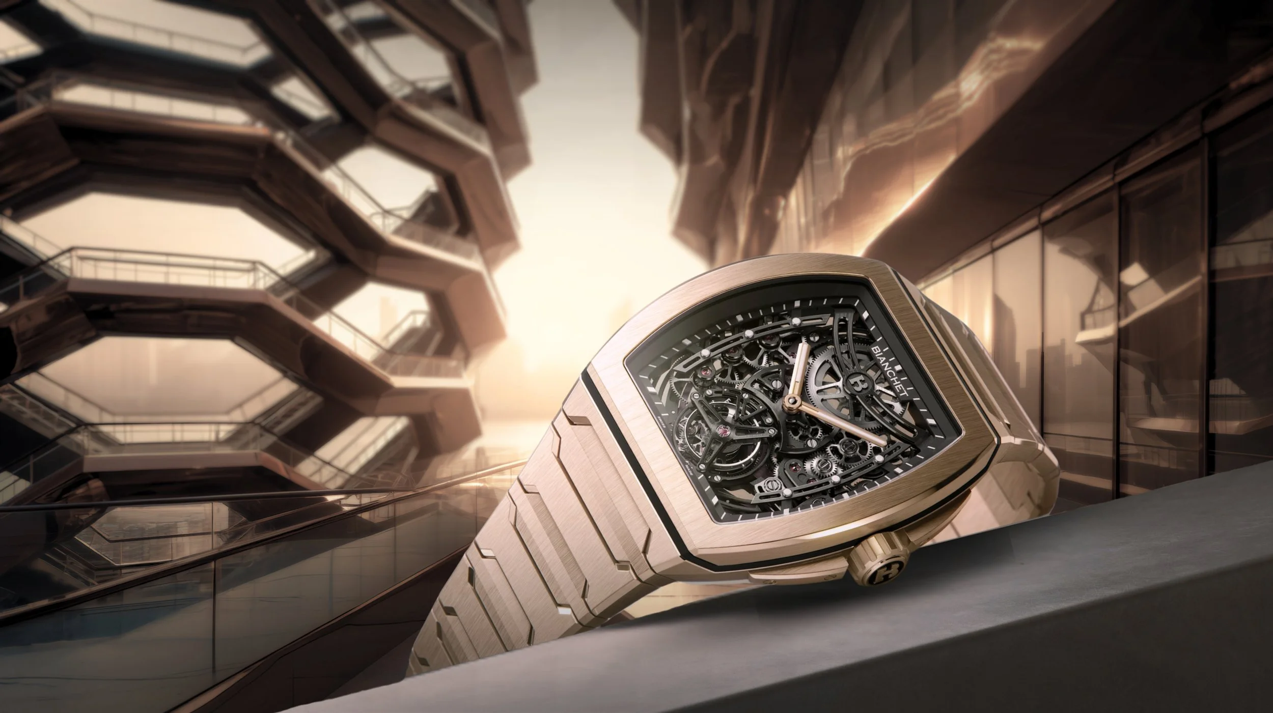 On the occasion of WatchTime New York, the unmissable horological event for North American watch collectors, Bianchet presents the evolution of its latest tourbillon collection: the UltraFino Gold Edition. This exceptional timepiece, crafted in 18K rose gold, combines sculptural design, architectural geometry, and the Maison’s watchmaking expertise, embodied by the ultra-thin automatic UT01 movement.
