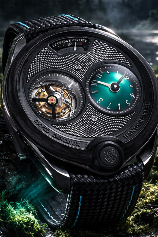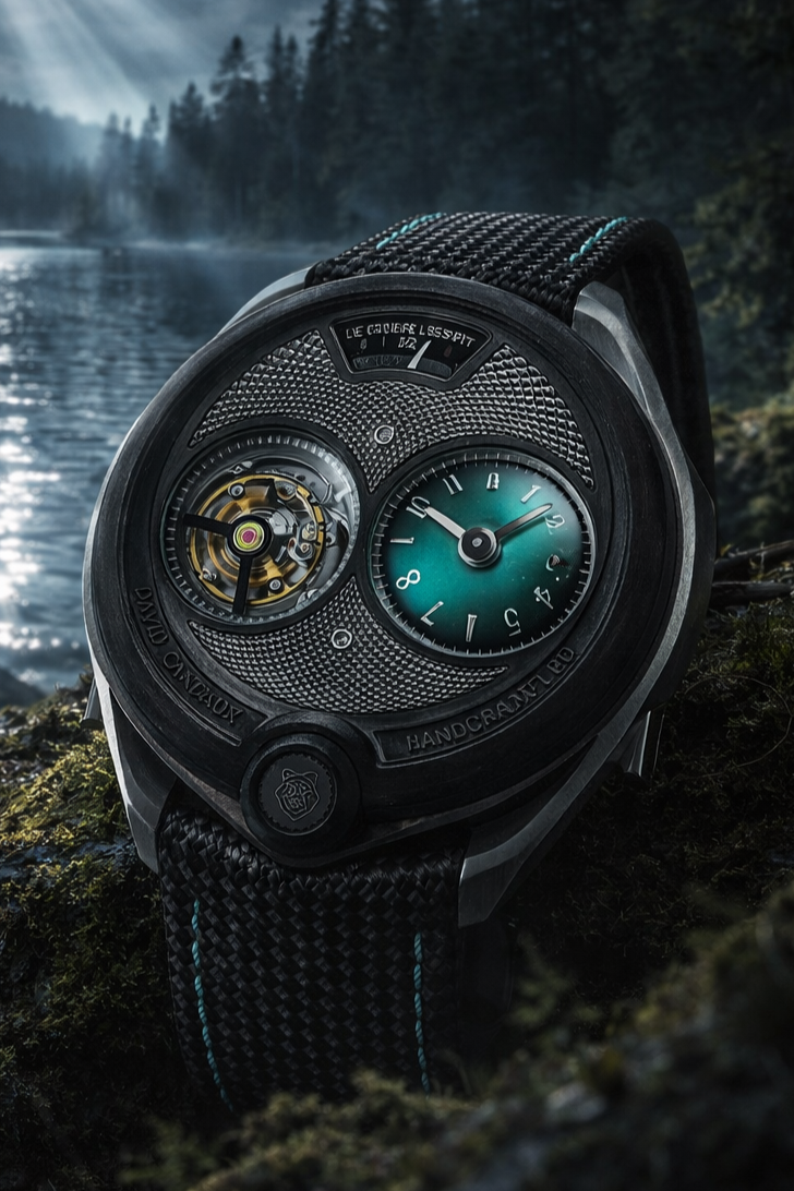 Carbon in this form belongs to aerospace structures, Formula 1 monocoques, and machines engineered to be both lightweight and sturdy. A vocabulary of performance. David Candaux brings it to the wrist with the same logic: a watch for a life in motion, for those who don’t want to feel the weight of what they’re wearing. But the veined surface of the UD carbon pulls the piece toward nature. It is not the bark; it is the heart of the wood. The same veins, the same lines that run and intersect, the same underlying order found in the trees of Risoux. The most technical material in this watch is also the one that creates the most direct link to the forest. This duality, mechanical and natural, contemporary and rooted, is the realm in which David Candaux works. It is also, at its core, what the Vallée de Joux has always been: a place where the workshop and the forest face each other.