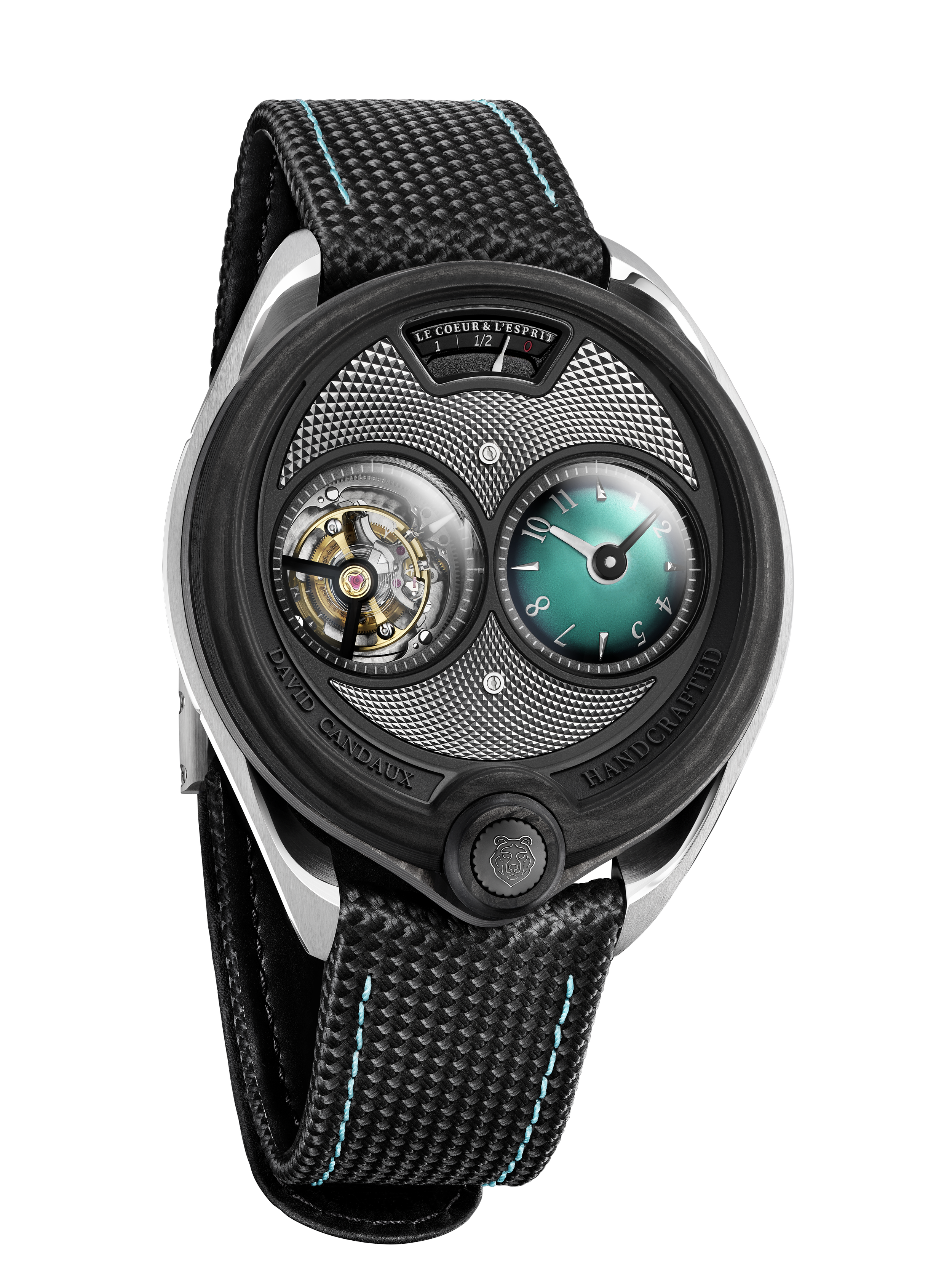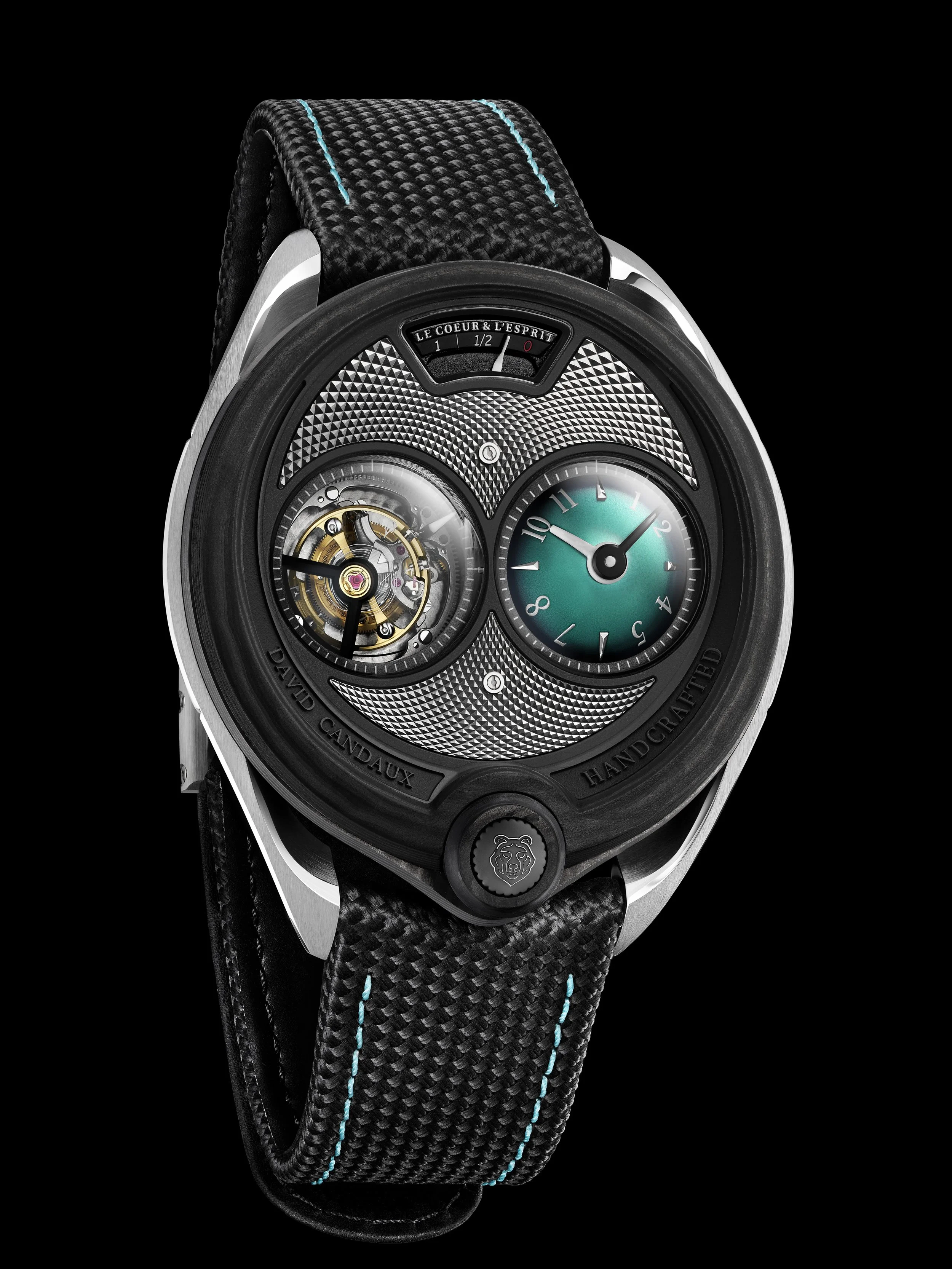 Following an initial version in forged carbon, which quickly found its audience, David Candaux continued to explore the potential of this material. The result: a timepiece in UD carbon and natural titanium, featuring a smoky topaz green dial. The lightest piece in the collection: 45 grams on the wrist. Water-resistant to 50 meters. Produced in a limited edition of eight pieces.
