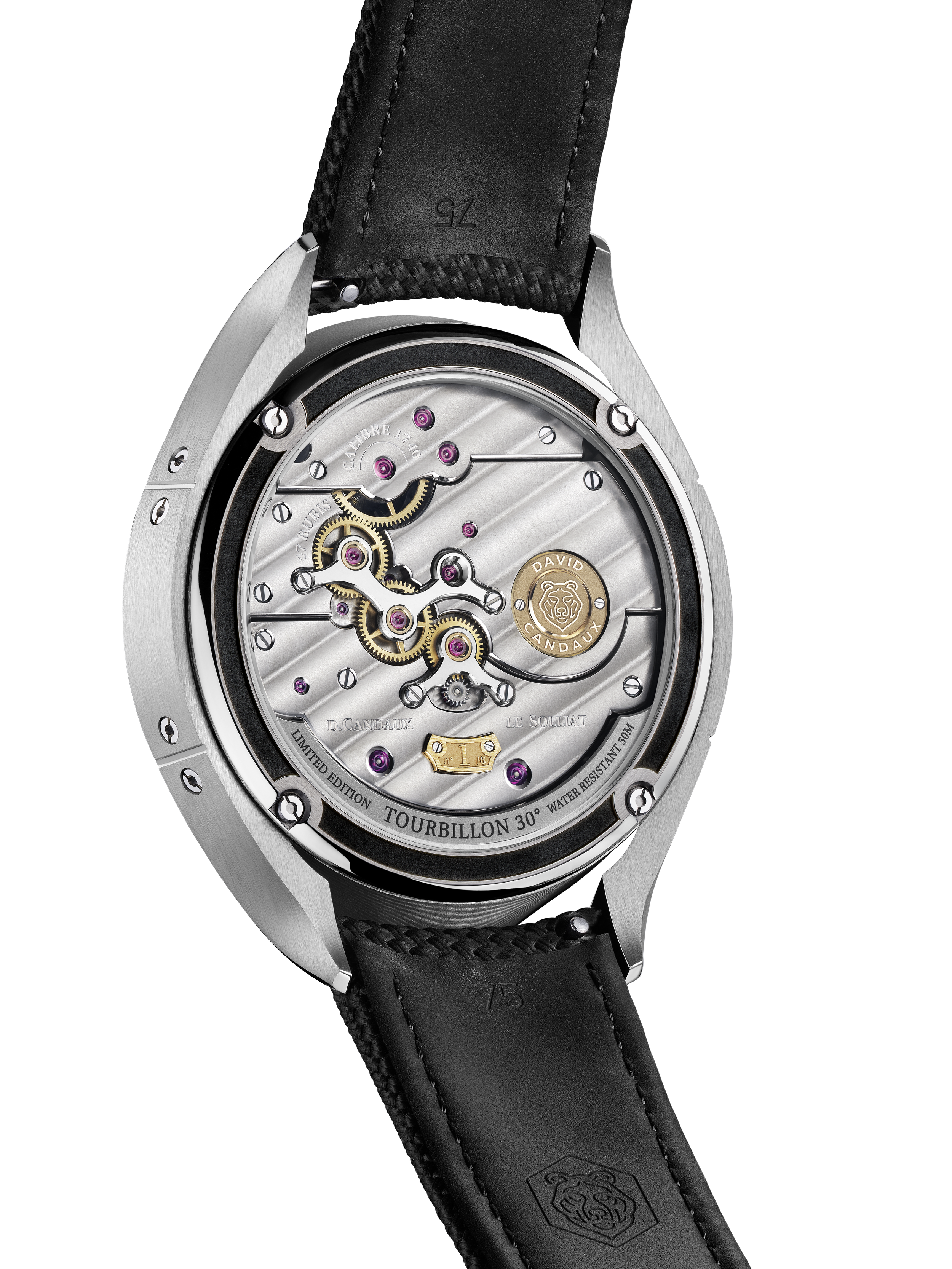 The H74 is developed entirely in-house at Le Solliat. Bridges and mainplate in Grade 5 titanium, chosen for its natural properties. Corrosion-resistant. Anti-magnetic. Thermally stable. Lightweight. Biocompatible. David Candaux remains the only watchmaker to have implemented this approach across all his movements.