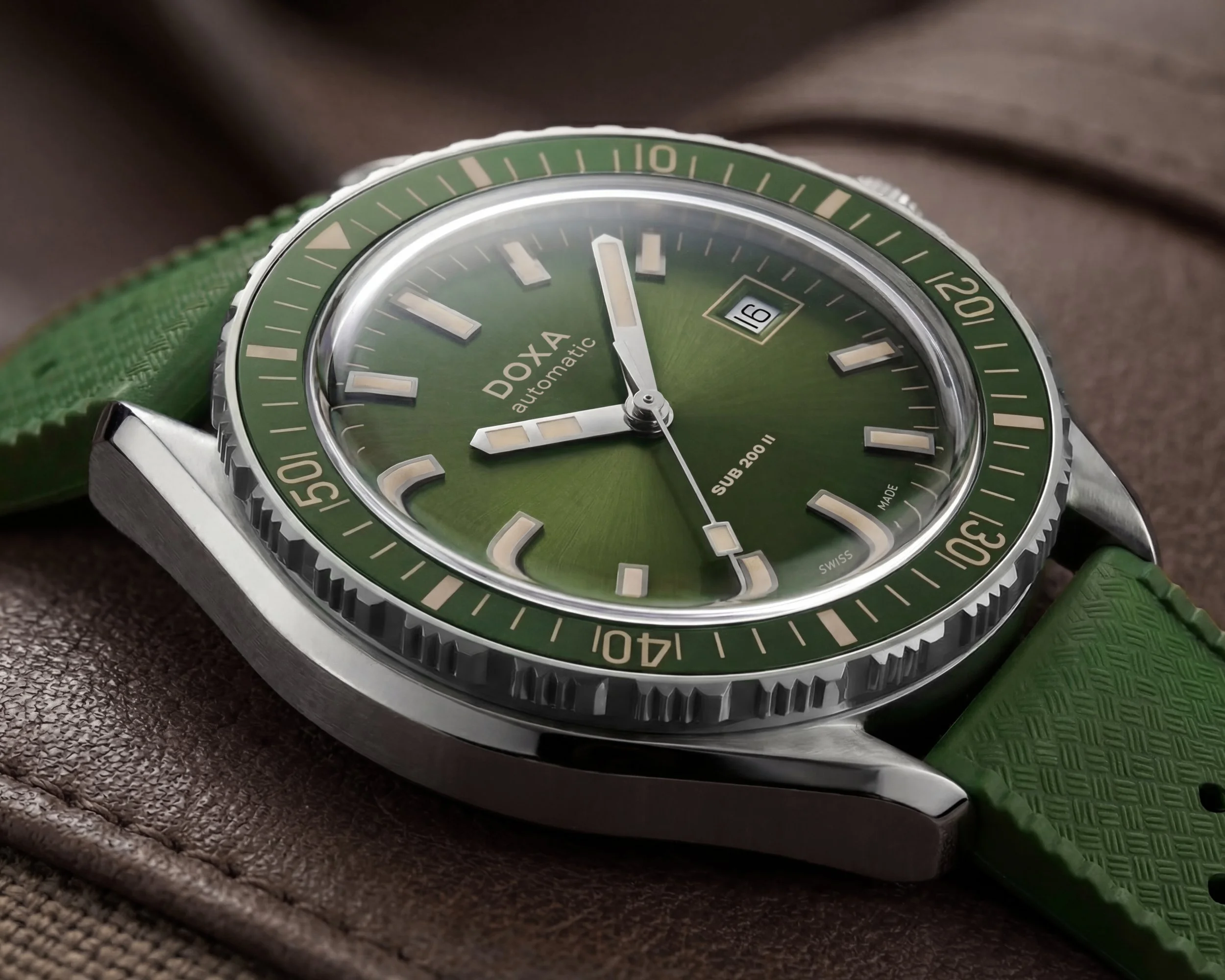 More than a stylistic detail, this treatment adds texture while maintaining DOXA’s hallmark legibility. The contrast between the gleaming center and the darker periphery reinforces the dial’s presence without disturbing its equilibrium, giving the SUB 200 II a more nuanced, contemporary personality – while keeping it firmly anchored in its professional dive watch heritage.