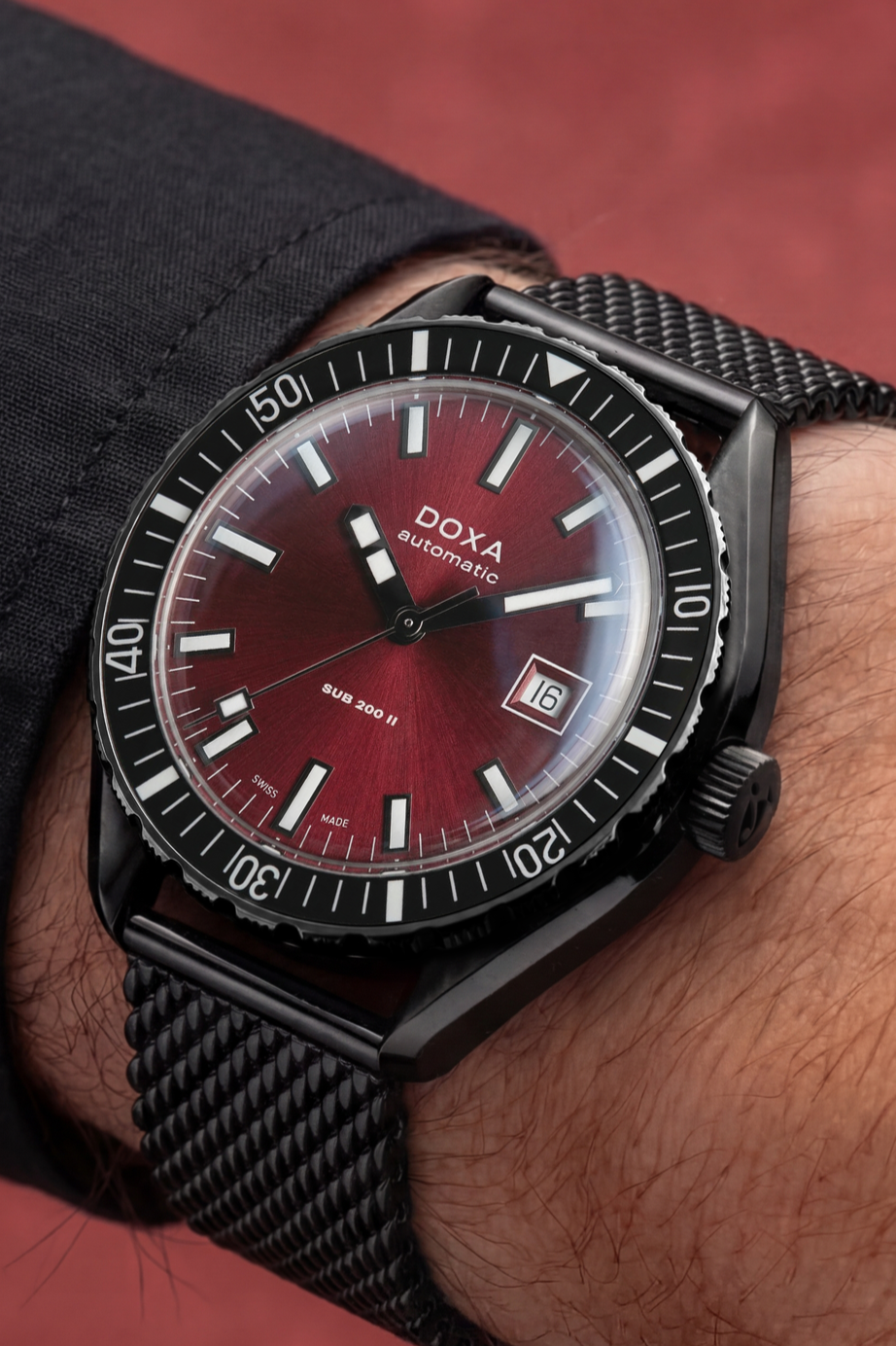 Added to this palette is a more assertive reference: a SUB 200 II fully coated in black DLC case, bezel and crown paired with a new deep red dial named Redcoral. The full-black treatment lends an intensely graphic, near-monochrome presence, to which the dial's depth adds understated warmth.