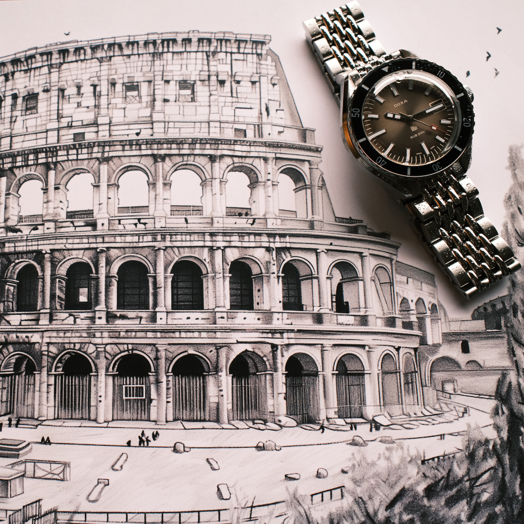Some cities pass through the centuries. Rome inhabits them. A city of stone and light, of contrasts and continuity, the Italian capital blends ancient grandeur with unique contemporary vitality. Every alley, every square, every monument bears the imprint of a history that never fades it transforms, reinvents itself, and endures. At the heart of this eternal city stands the Colosseum, a universal symbol of strength, architecture, and memory. More than a monument, it embodies an idea: beauty that withstands the test of time. It is this energy, both timeless and vibrant, that inspires the DOXA SUB 200 Grande Roma, the first special series dedicated to the Italian market and the result of the collaboration between DOXA and Gioielleria Grande. More than 50 years after its launch, enriched by a unique history, the iconic SUB model is presented for the first time in a special series dedicated to Italy.