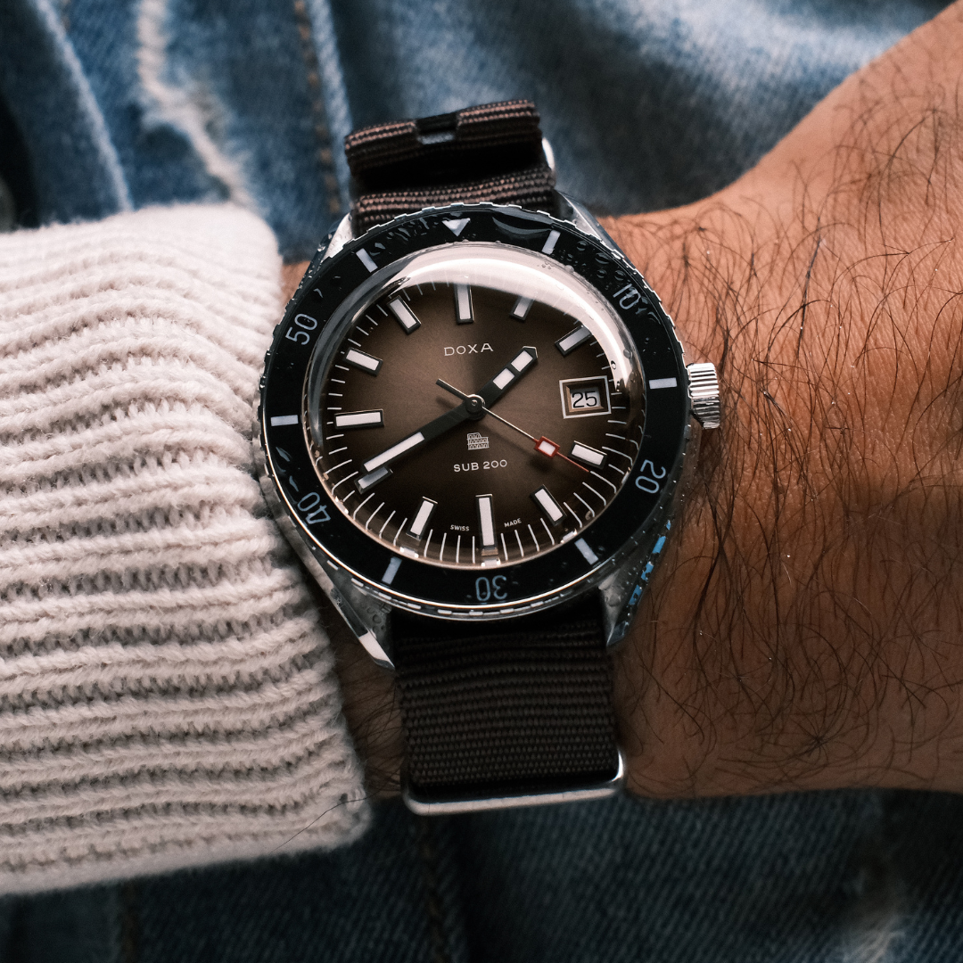 Within the DOXA collection, the SUB 200 embodies the very essence of the dive watch according to the Biel-based manufacture. Directly inspired by the historic models that defined the 1960s, it combines immediate legibility, proven robustness, and a strong visual identity. With a 42 mm diameter, crafted from a single block of the highest-quality 316L stainless steel and water-resistant to 200 meters, the case is protected by a scratch-resistant, anti-reflective domed sapphire crystal in a “glass box” style. The black unidirectional bezel and generously luminescent indices ensure optimal readability in all conditions.