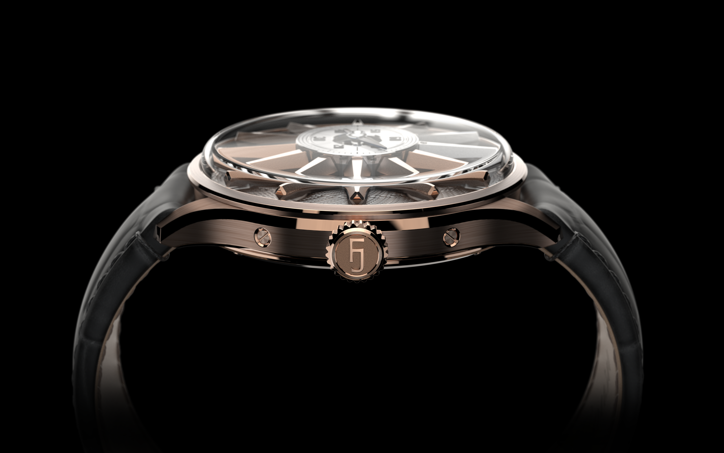 The presentation of the Automatic Chronograph Evolution at the 2009 Grand Prix d’Horlogerie de Genève brought his creative talent into the spotlight. For this bold timepiece, he inverted the movement structure to allow full contemplation of the winding system from the dial side. More than a concept watch, this high-performance chronograph, offering 50 hours of power reserve and perfect legibility through the cut-out oscillating mass, featured an exclusive system patented by Jouvenot Manufacture after three years of research and development. This device preserved the chronograph architecture while guaranteeing perfect visibility of the complication from the case back. This unprecedented vision of the automatic movement became the inspiration for several major creations.