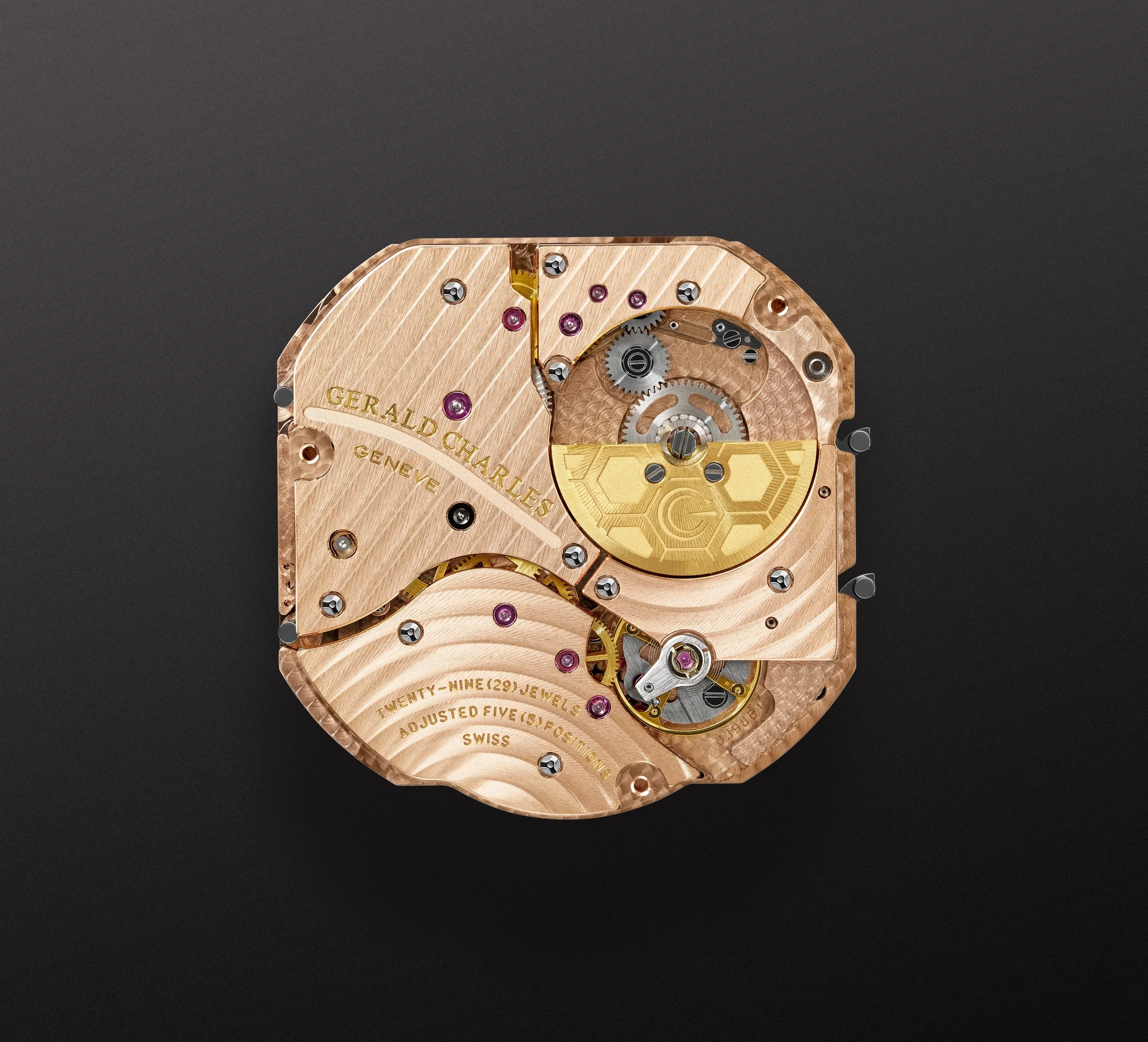 Another element in the Masterlink Perpetual Calendar that illustrates the Maison’s detail obsession is the case back. It features an asymmetrical sapphire crystal, a notoriously complex component to manufacture and to make water-resistant. Its shape precipitated a number of additional processes, including developing bespoke gaskets that would ensure the watch’s water resistance to 100 metres. This particularly onerous task had not been attempted in watchmaking before, but driven by its “No Compromise” philosophy, the Maison’s engineers chose difficulty – and prevailed. Gerald Charles has patented the gasket shape. Through this transparent case back, the wearer is afforded an uninterrupted view of a movement that tells the story of Gerald Charles. The mainplate and bridges are shaped, arranged and finished to reflect the geography of Geneva, Gerald Charles’s home city. Straight Geneva stripes represent the city’s roads, while curved, undulating Geneva stripes echo the surface of Lake Léman. The narrow gap between these components is articulated to reflect the contours of the city’s River Rhône, while a black ruby marks the position of the Gerald Charles atelier on the Rue du Montblanc. Finishing the story, the balance wheel sits in the position of the lake’s famous Jet d’Eau. Beyond, also clearly visible is the movement’s gold-gilded micro-rotor, which is engraved with a hexagonal honeycomb motif, an echo that ties the Masterlink to its sister Maestro design.