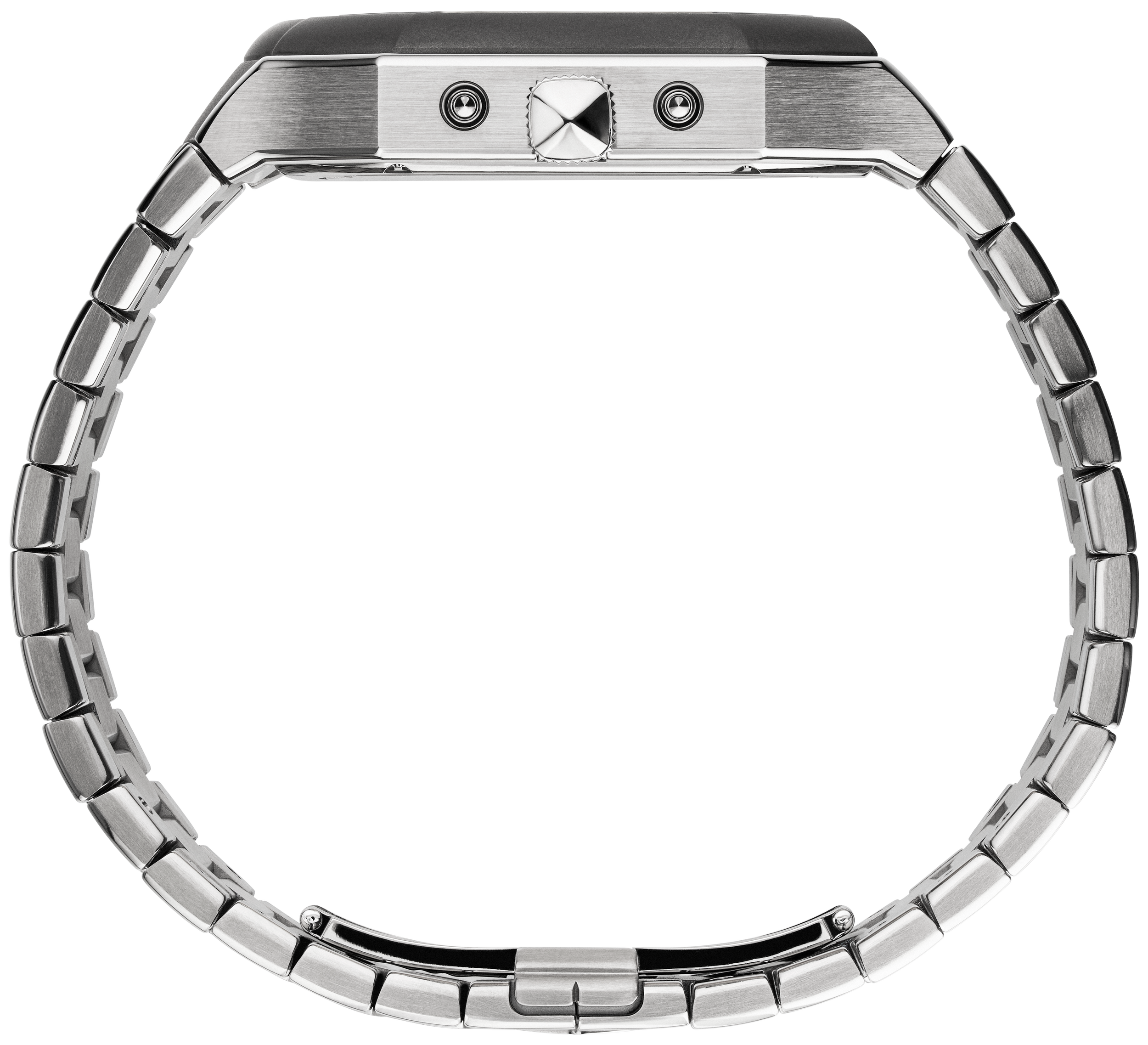 This is just one of a number of finishes applied to the case and crown. The case flanks are vertically brushed, with further contrast added by rounded and polished lugs. The same polished finish then runs under the bezel and around the case edge, from lug to lug, creating a fluid, almost liquid dynamic that contrasts with the brooding, resolute look of the case and bezel. The crown is knurled for ease-of-use, with a mirror-polished, pyramid-shaped tip. Together, these finishes enhance the watch’s architectural and athletic dimensions. That impression continues through the bracelet design. While its middle links have the Darkblast® finish, the outer links are polished on top and vertically brushed along the sides, with polished, soft-curve chamfers, completing a high-concept bracelet with three distinct finishes. This intricate mix of finishes required a bespoke tooling solution. The bracelet remains sporty and ergonomic thanks to its thinness, lightness and tapering.