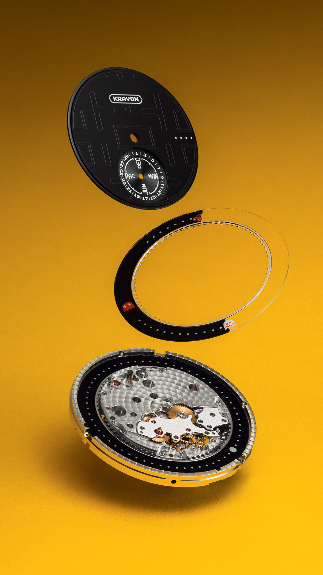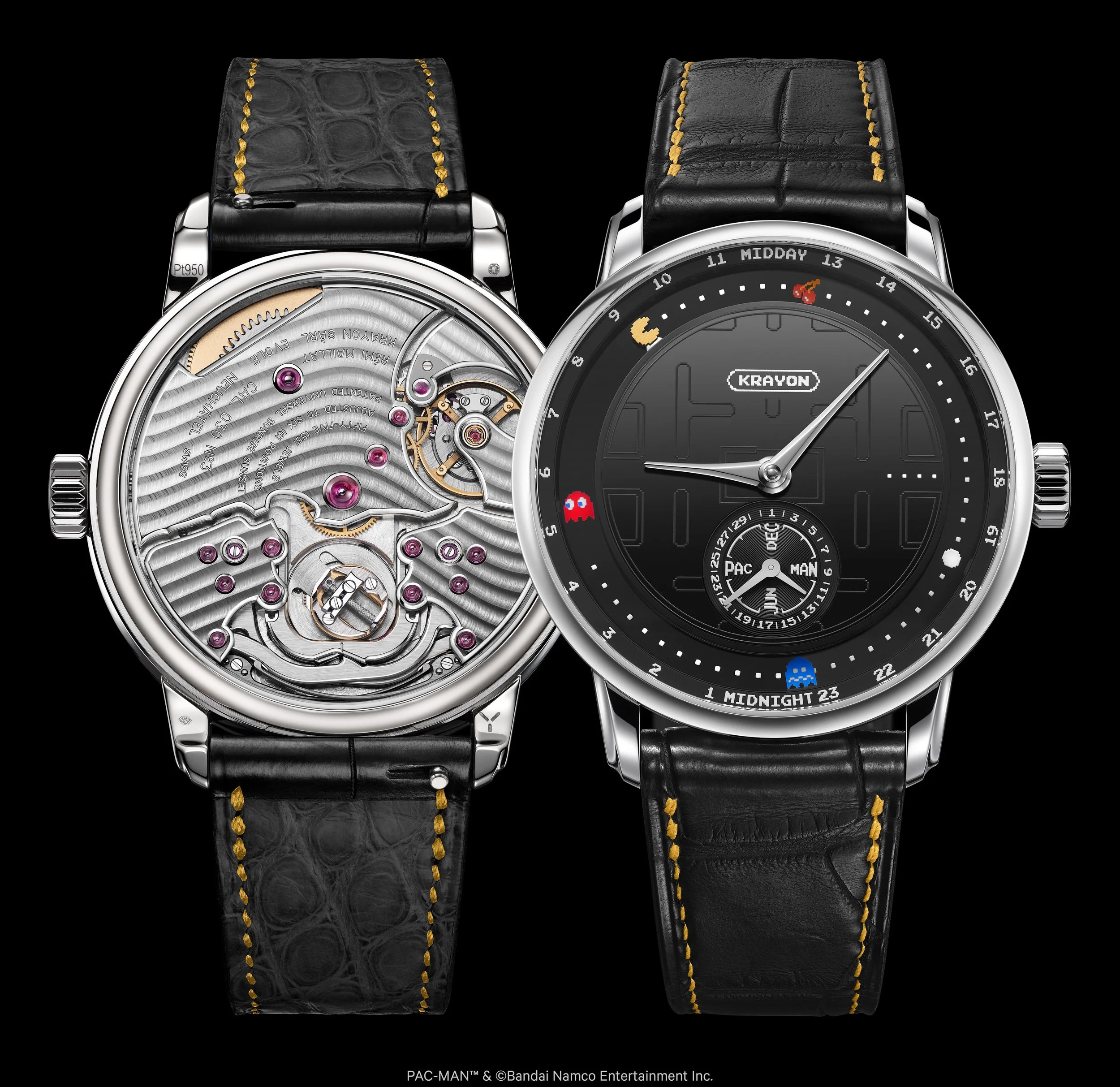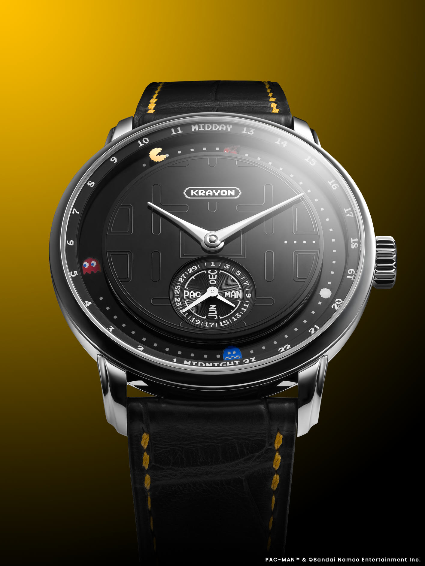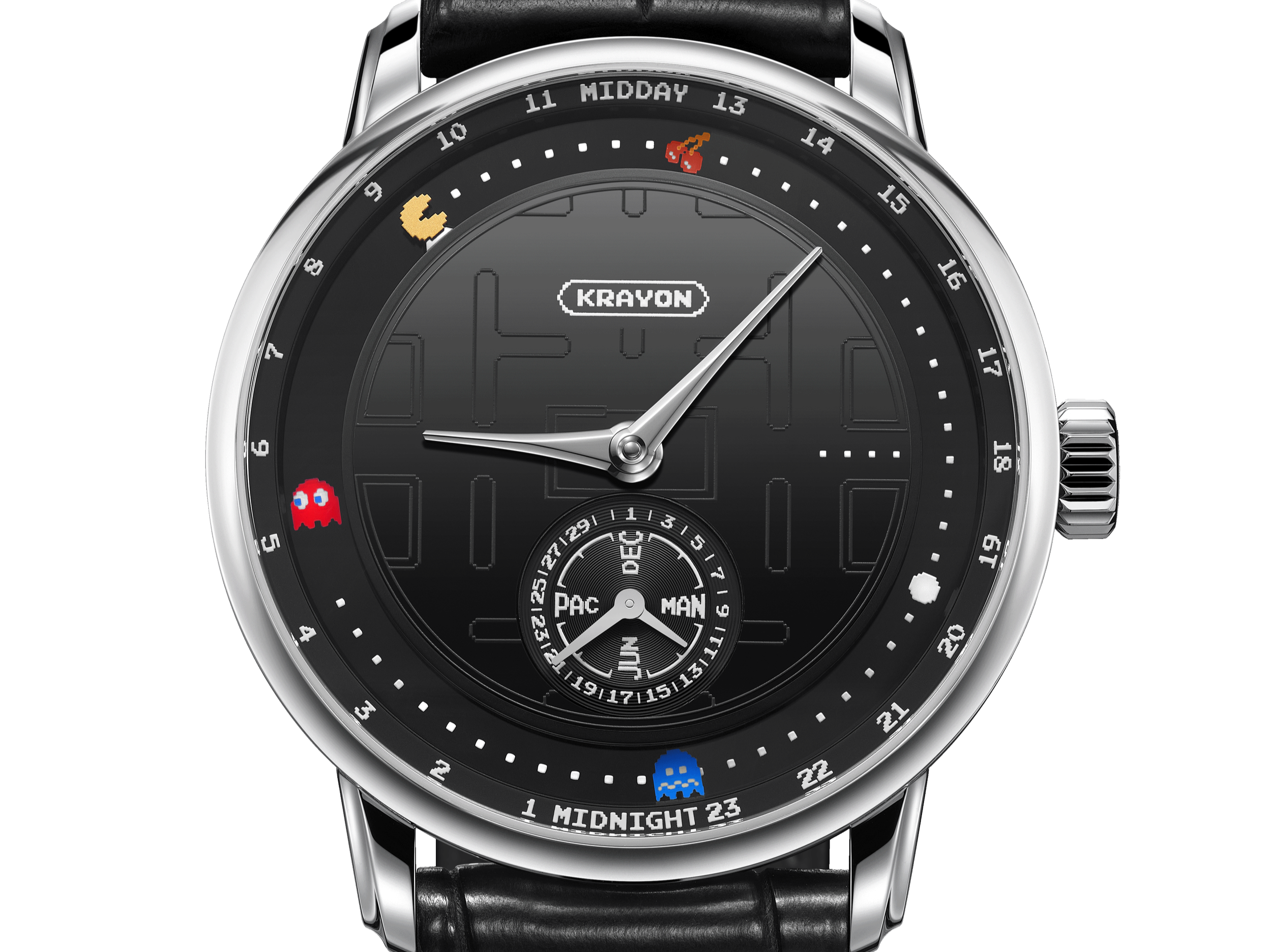 For this series, Krayon chose to return to PAC-MAN’s very origin, the first version of the game, rendered in exact scale, with all the rigour and finesse this demands. The iconic yellow character, the dots, the fruit and the ghosts retain their precise proportions, as if suspended in their 1980 state. On a polished onyx dial perfectly smooth, deep as night, the famous maze unfolds, delicately pad printed for a translucent effect. It becomes visible only when light strikes at a precise angle, a discreet nod, an almost conspiratorial gesture reserved for the wearer. Along the outer circumference, the fruit and ghosts, all hand-painted, appear to float within this mineral universe. The inscriptions MIDDAY, MIDNIGHT, MARCH, SEPTEMBER, adopt the original pixelated typography, while the Krayon logo becomes a cartouche distilled into its essential pixels.