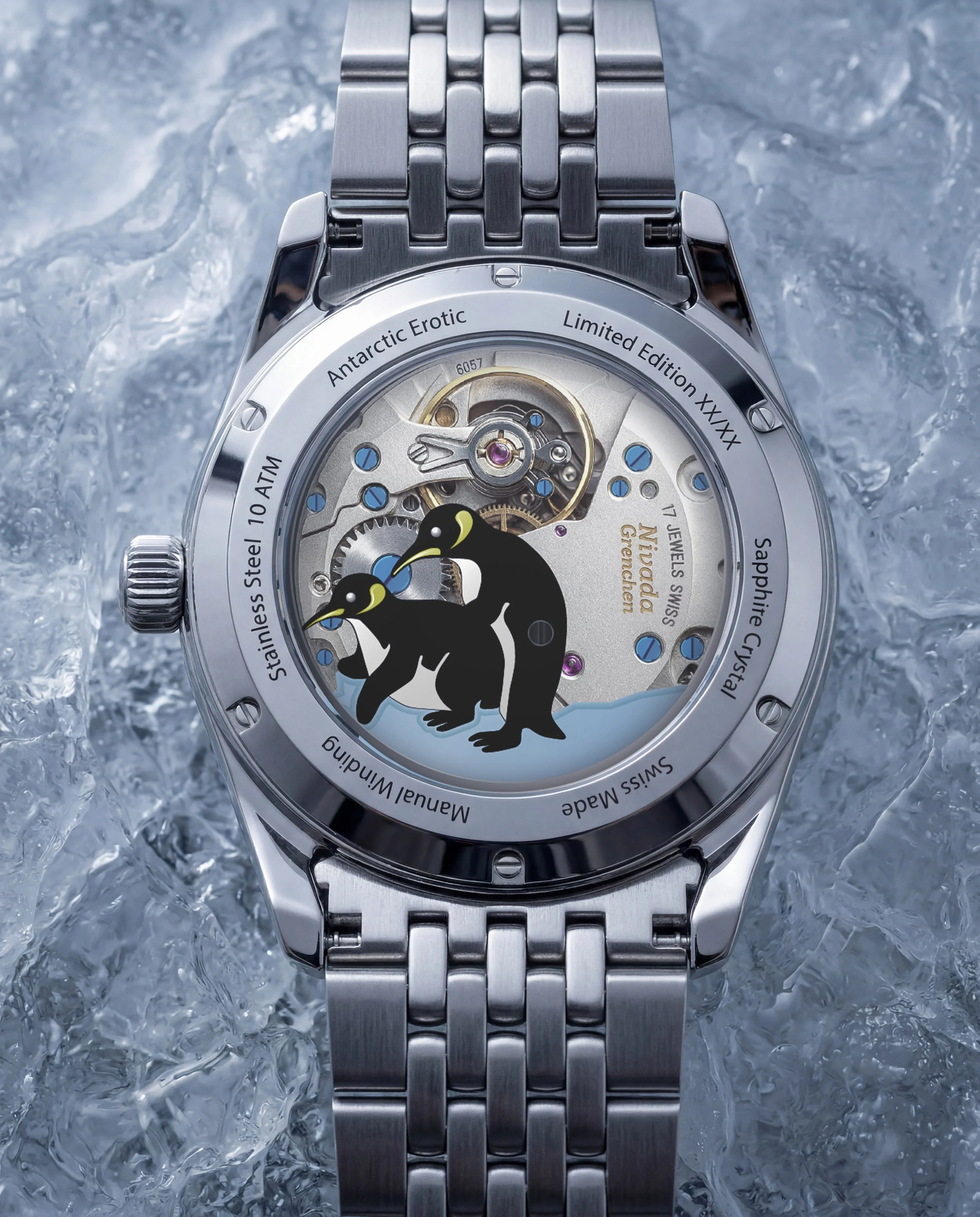 The Antarctic name is rooted in the polar exploration era that shaped the model in the 1950s. Introduced in 1954, the Antarctic was the first watch to reach Antarctica and was tested during the U.S. Navy’s Operation Deep Freeze missions in 1955–1956. Penguins, highly present in expedition imagery, became a natural symbol of that world and appeared on the casebacks of several vintage Nivada models, before being carried through on recent Antarctic reissues. With the Antarctic Erotic, Nivada Grenchen gives that historic emblem a new playful twist while adding a real-world conservation dimension.