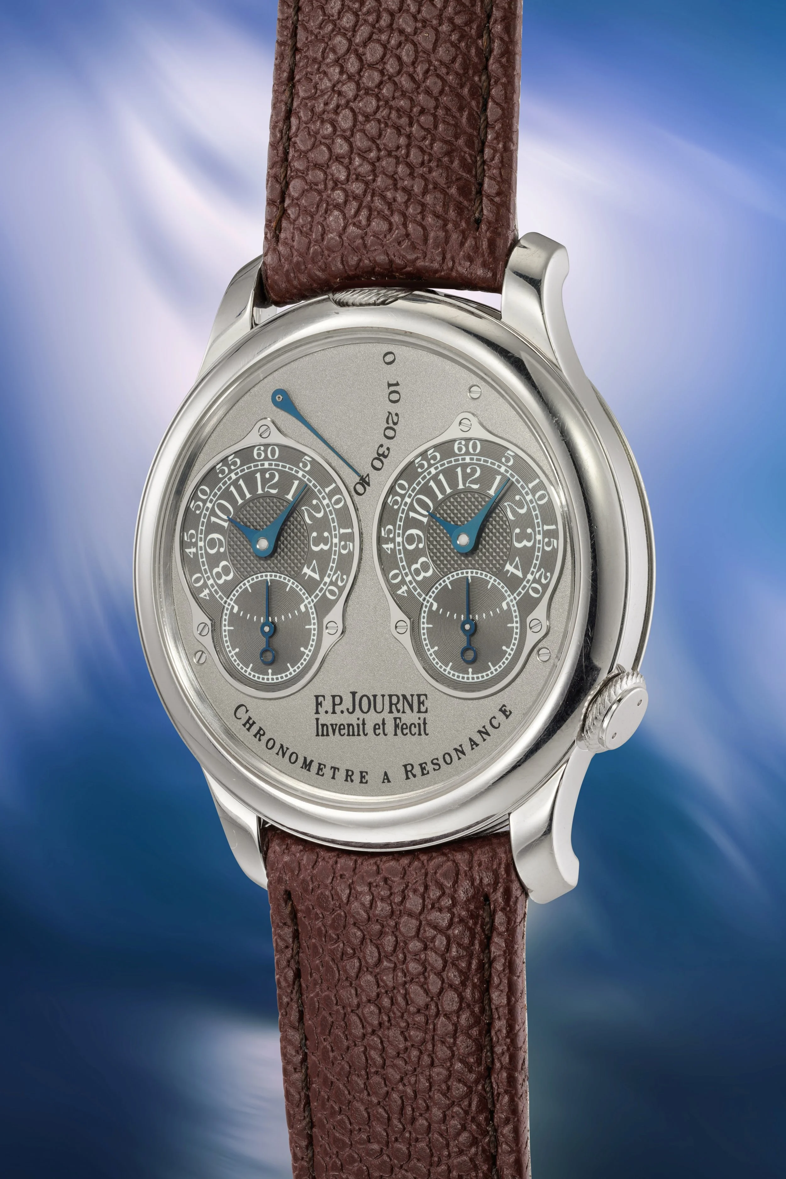 Chronomètre à Résonance ‘Pisa,’ Platinum, Circa 2009 Estimate: CHF 450,000 – 900,000 F.P. Journe’s Chronomètre à Résonance is among the most important technical achievements of modern watchmaking. Inspired by the work of 18th-century clockmaker Antide Janvier, the watch employs two balance wheels beating in resonance to enhance precision. The present example is an exceptionally rare, limited edition produced exclusively for the Milan-based retailer Pisa in a series of just five pieces. Housed in a platinum case and fitted with an 18k pink gold movement, it features a striking 18k white gold dial with dark grey ruthenium-plated subdials that create dramatic contrast.