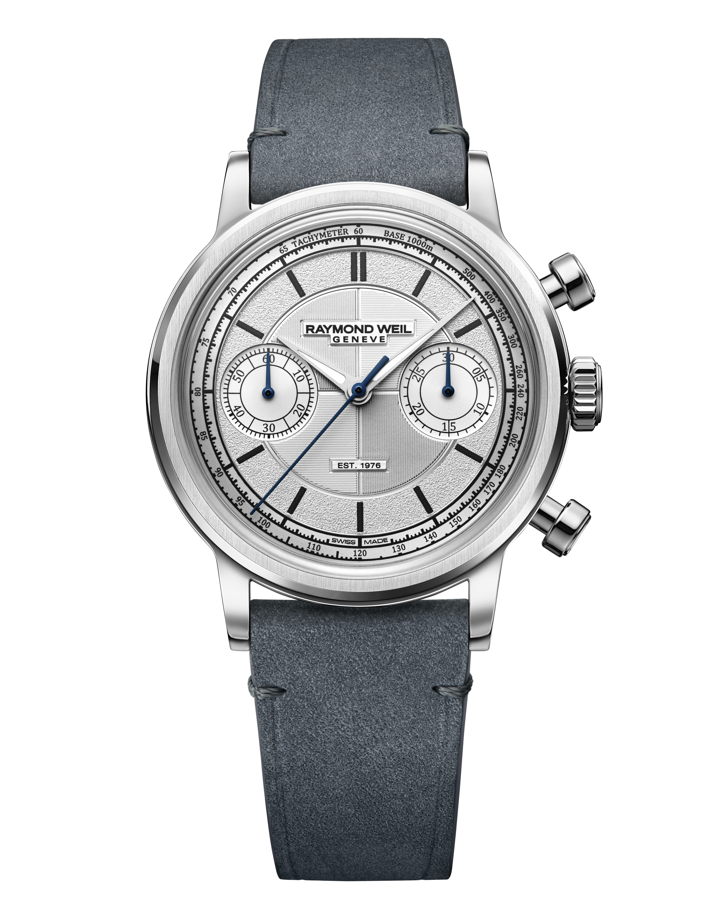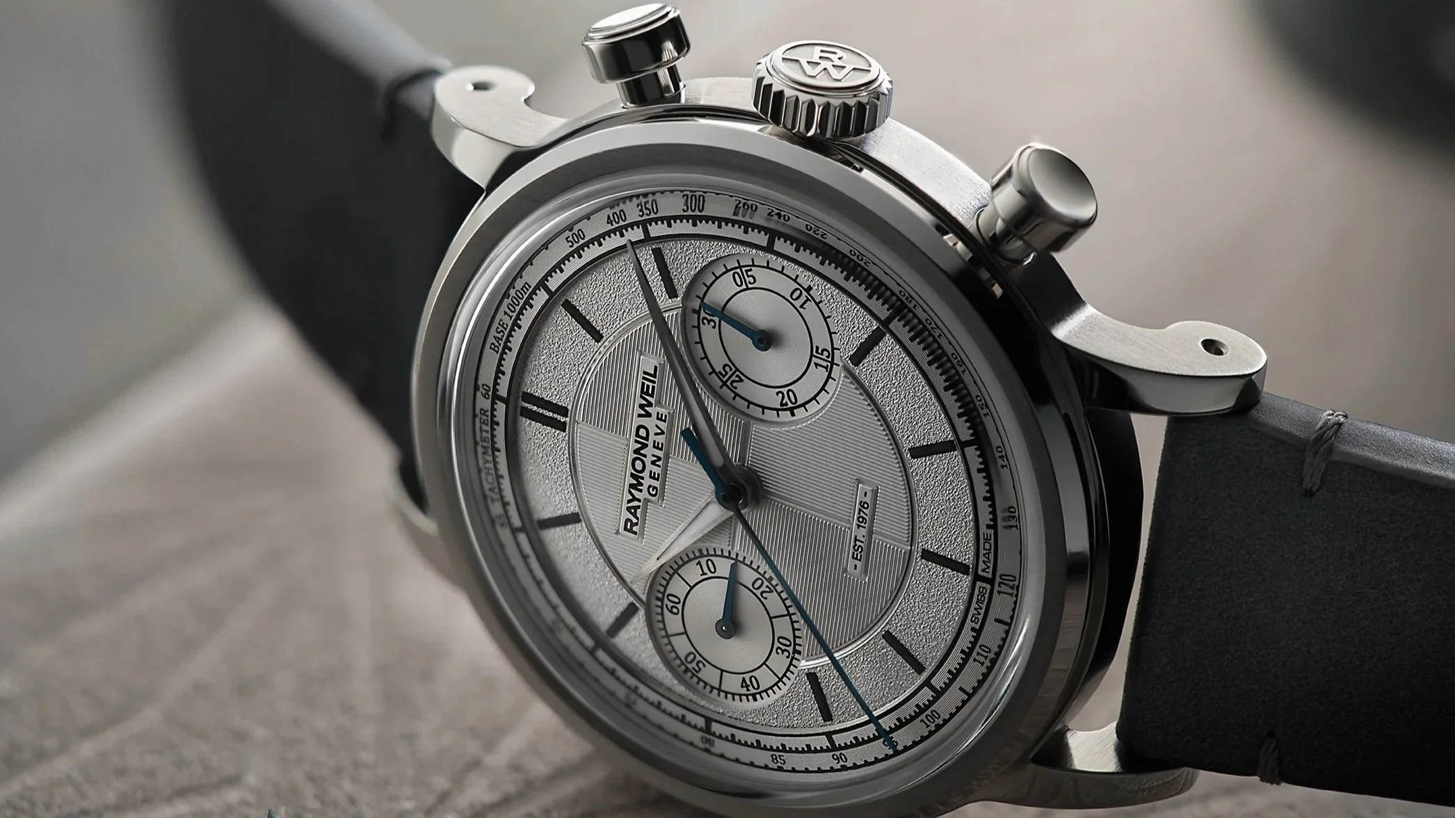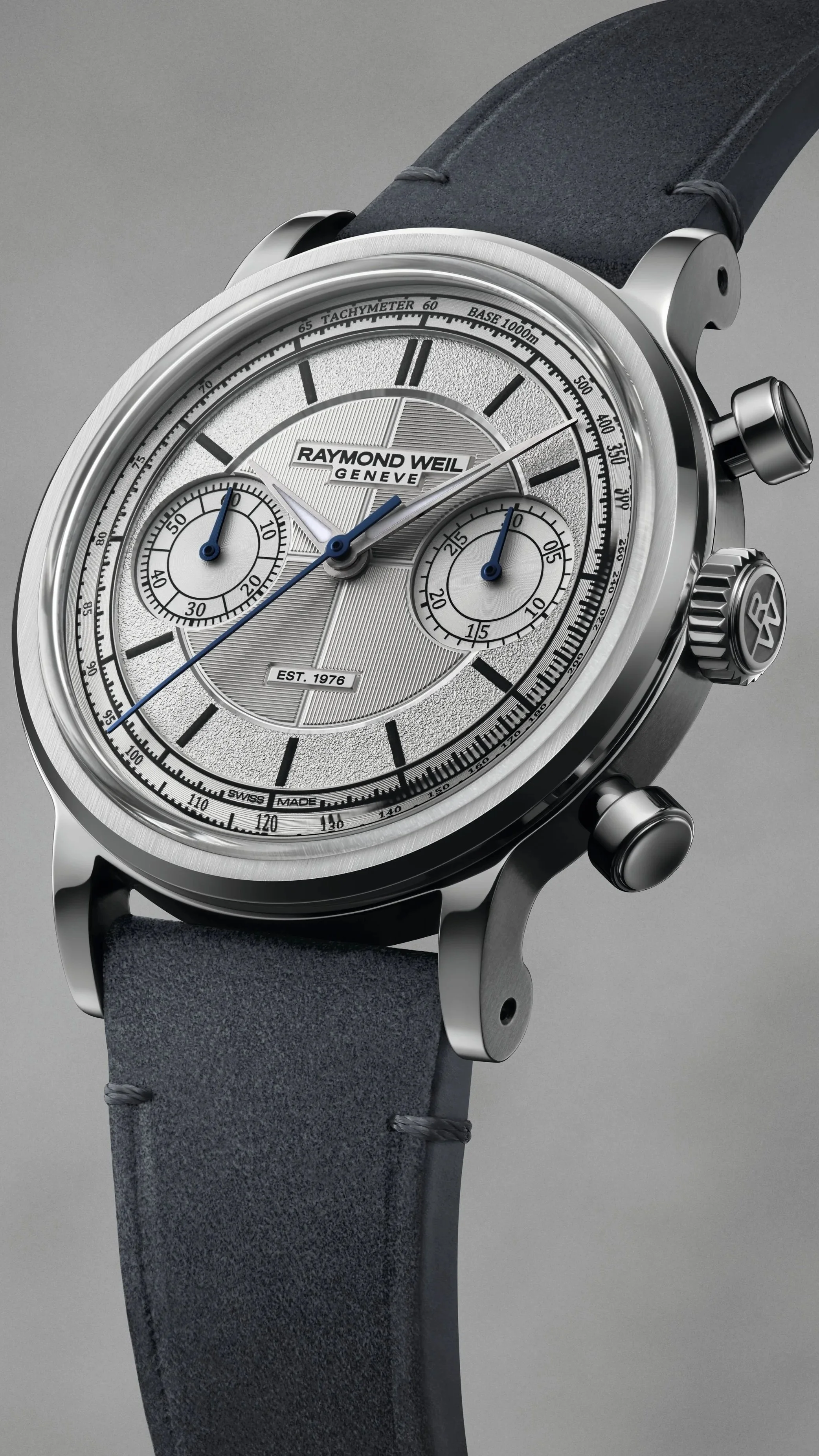 Housed in a 37 mm steel case topped with a white gold bezel, The Fifty respects the historic proportions of manual-wound chronographs. The steel crown and restrained case lines reinforce the timeless elegance of the piece. Limited to only 50 pieces, resonating with the Maison’s 50th anniversary, The Fifty embodies Raymond Weil’s watchmaking expertise, its attachment to Swiss tradition and its ability to unite artisanal excellence with a contemporary vision. The dial of The Fifty has been conceived as a true horological construction. Composed of four distinct parts, each element is finished separately to achieve superior levels of refinement before precision assembly. This architecture creates an immediate sense of depth, relief and visual richness characteristic of the millesime collection and inspired by neo-vintage design codes. The rehaut, which supports the tachymeter scale, structures the dial and enhances functional legibility, elevated by a diamond-cut filet that adds sophistication. The area beneath the indexes features a grained texture, bringing crystalline volumes that subtly reflect light. The central section is stamped with a “tapestry” motif composed of alternating gadroons inspired by the collection’s vertical satin finishing and central cross, capturing light while hosting Super-LumiNova®-treated indexes that affirm the contemporary character of the piece. This monobloc element is signed with a black transfer of the Raymond Weil logo and “EST. 1976”, subtly raised to elegantly catch light.