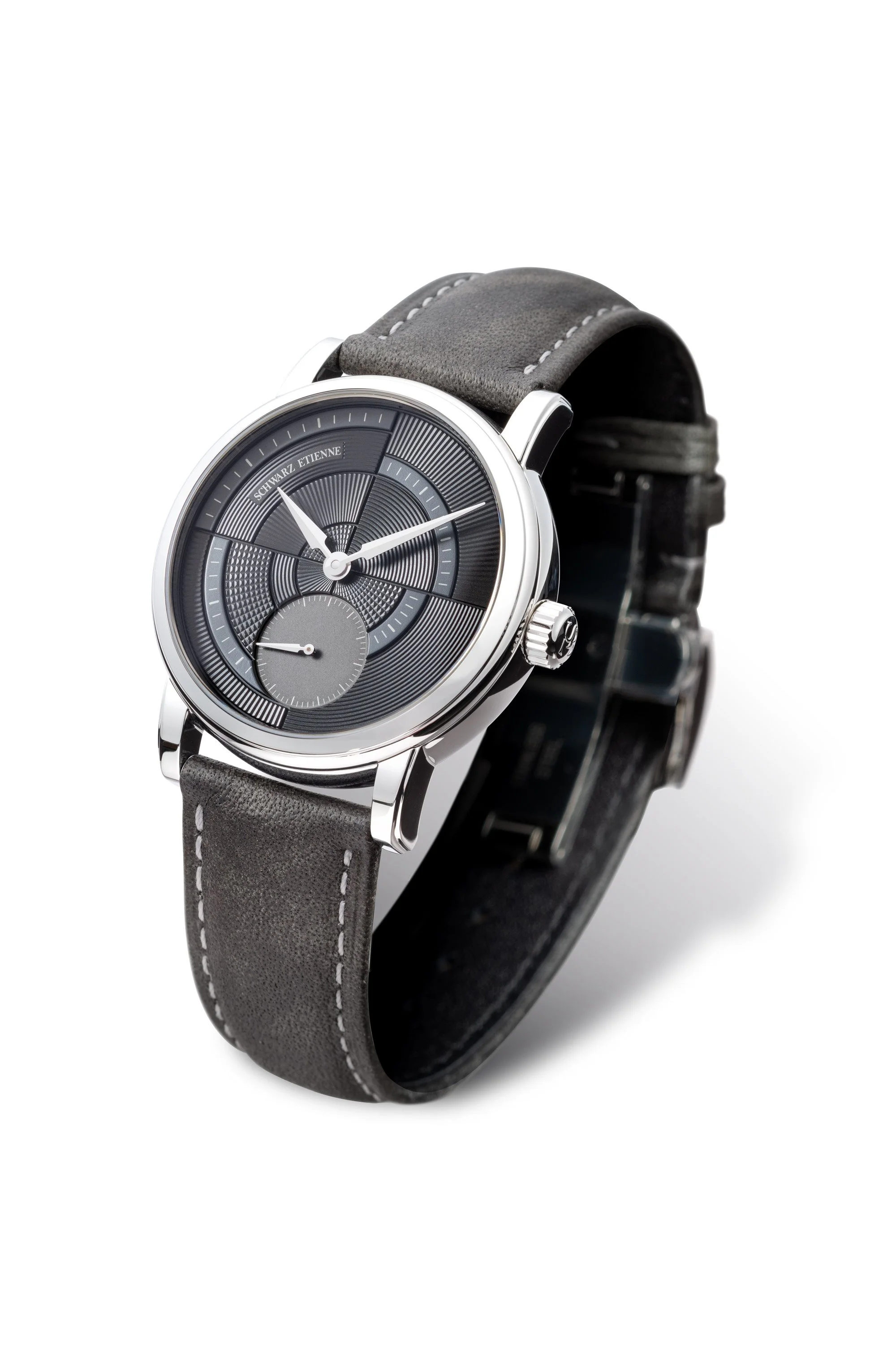 Schwarz Etienne enhances the depth and refined texture of the black dial through a subtle play of shadows and light, orchestrated by its reliefs. This effect is further emphasized by a polished 39mm stainless steel case, strengthening the monochromatic aesthetic of the watch. The hour and minute hands, with their elegant and minimalist lancine-style, stand out against the hand-guilloché black dial, offering optimal readability of the time. The small second is positioned at 6 o’clock on a delicately sandblasted anthracite subdial, subtly distinguishing itself from the rest of the dial. This sober and distinguished aesthetic extends to the patinated black leather strap, complemented by a tone-on-tone lining and a stainless steel folding buckle.
