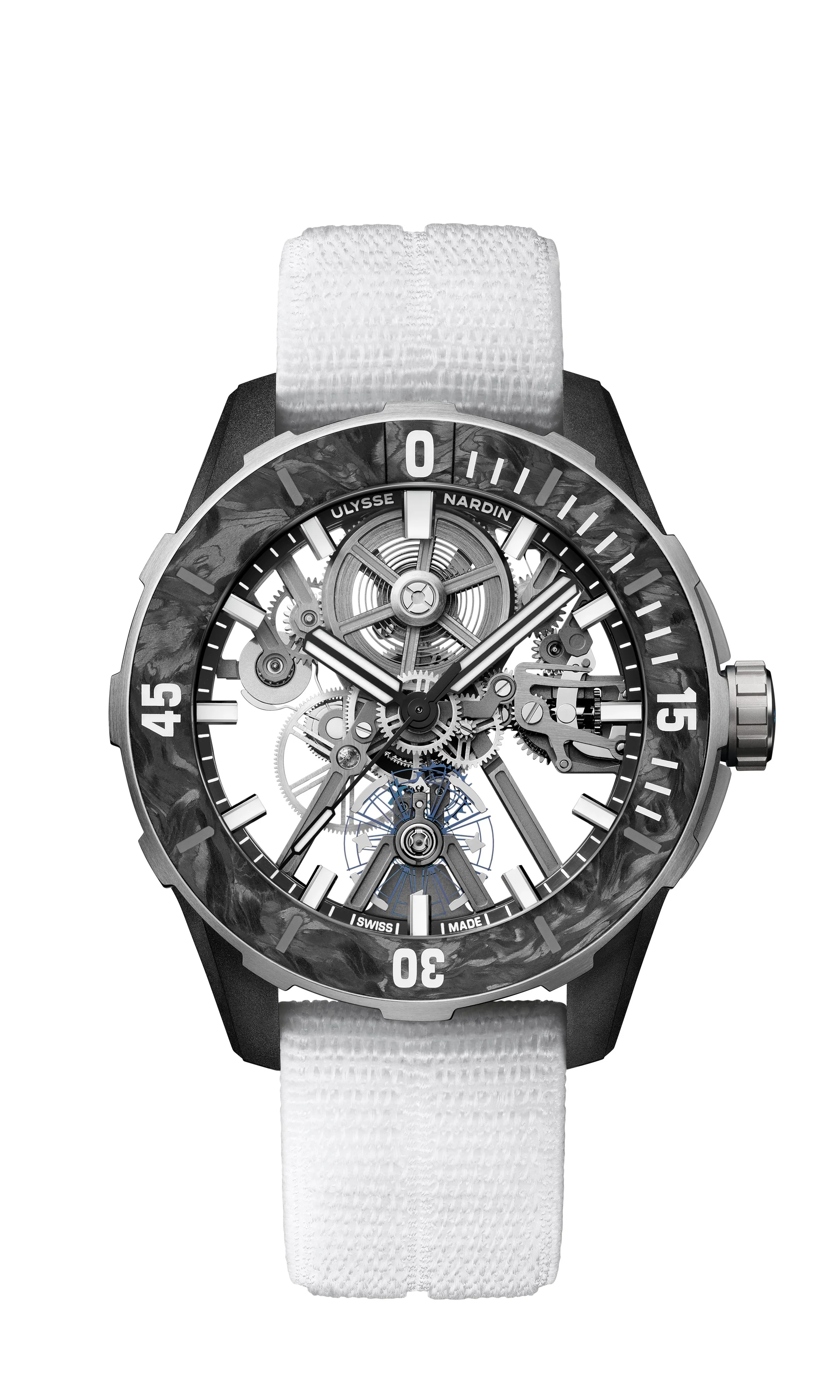 Ulysse Nardin partnered with market leaders and start-ups for the Diver [AIR] project, taking innovation further. The titanium in its movement and middle case is 90% recycled, sourced from TiFast and processed by Thyssenkrupp. The side case parts use Nylo®-Foil, a blend of 60% Nylo® from ocean netting and 40% carbon fibre from IMOCA boats, recycled by Extracthive and processed by Lavoisier Composites. The bezel insert is forged from upcycled CarbonFoil, and the escapement is made from an upcycled silicon wafer by Sigatec.